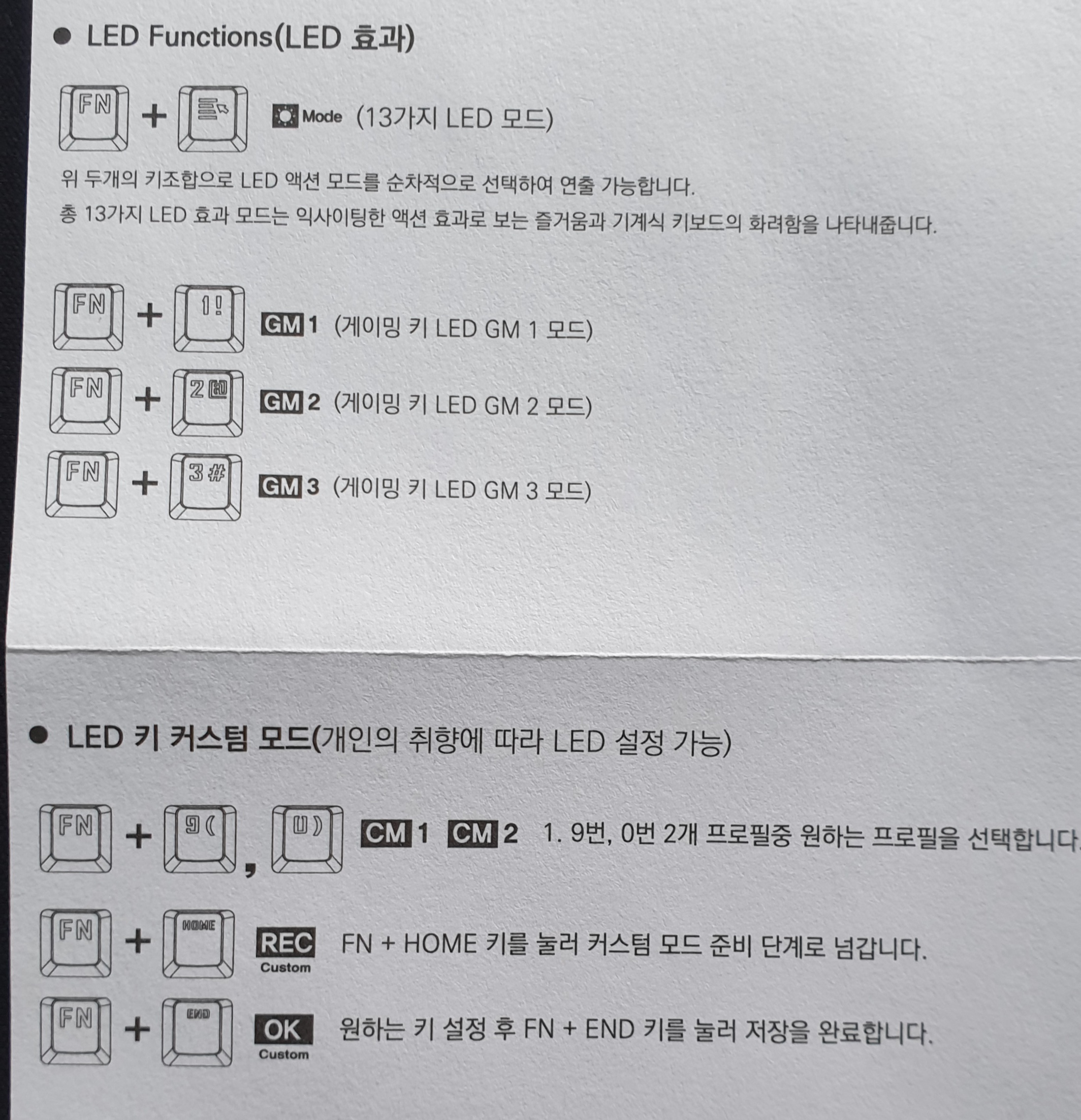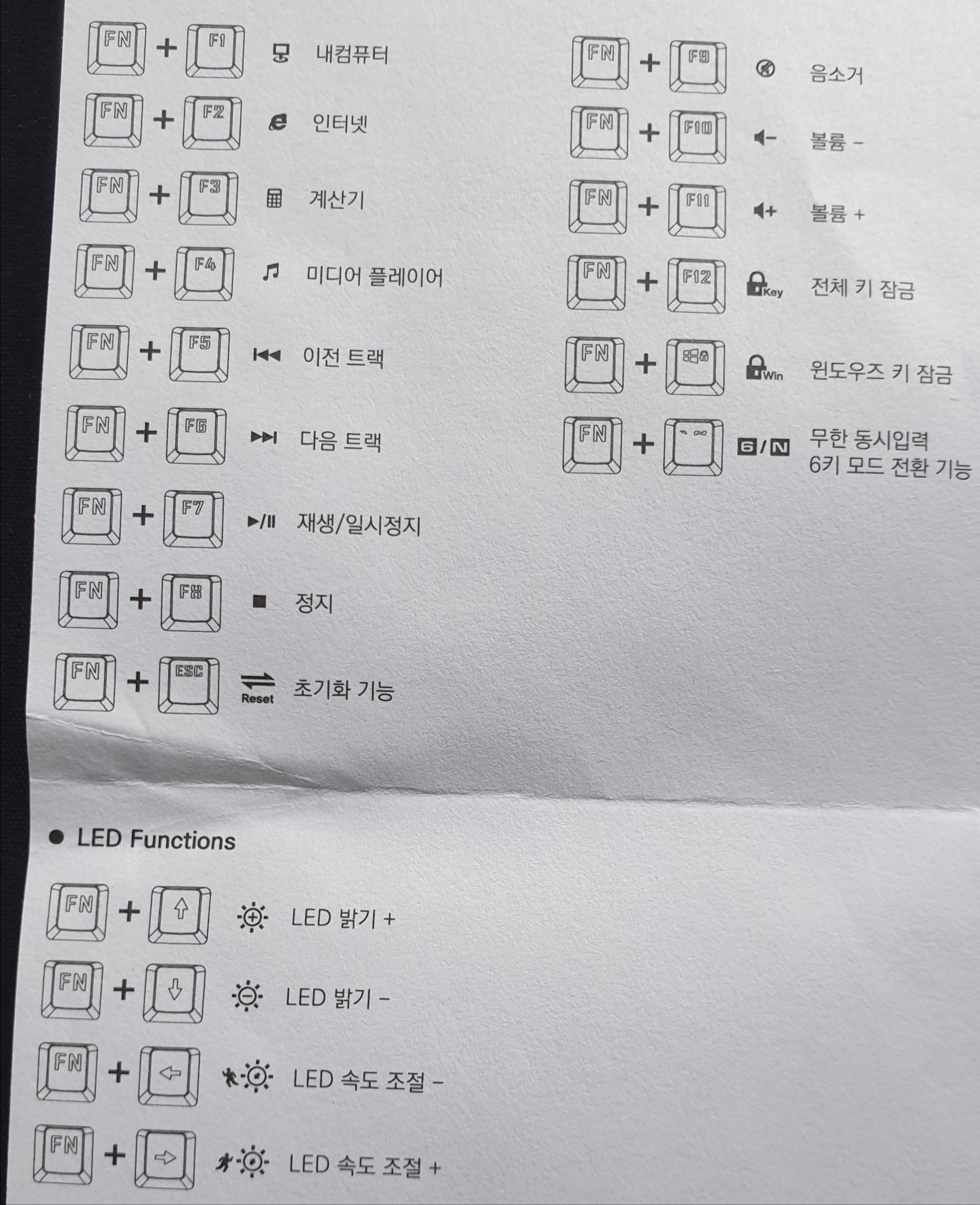 게임 관련 키만 LED가 들어옵니다. (A, S, D, W), 방향키