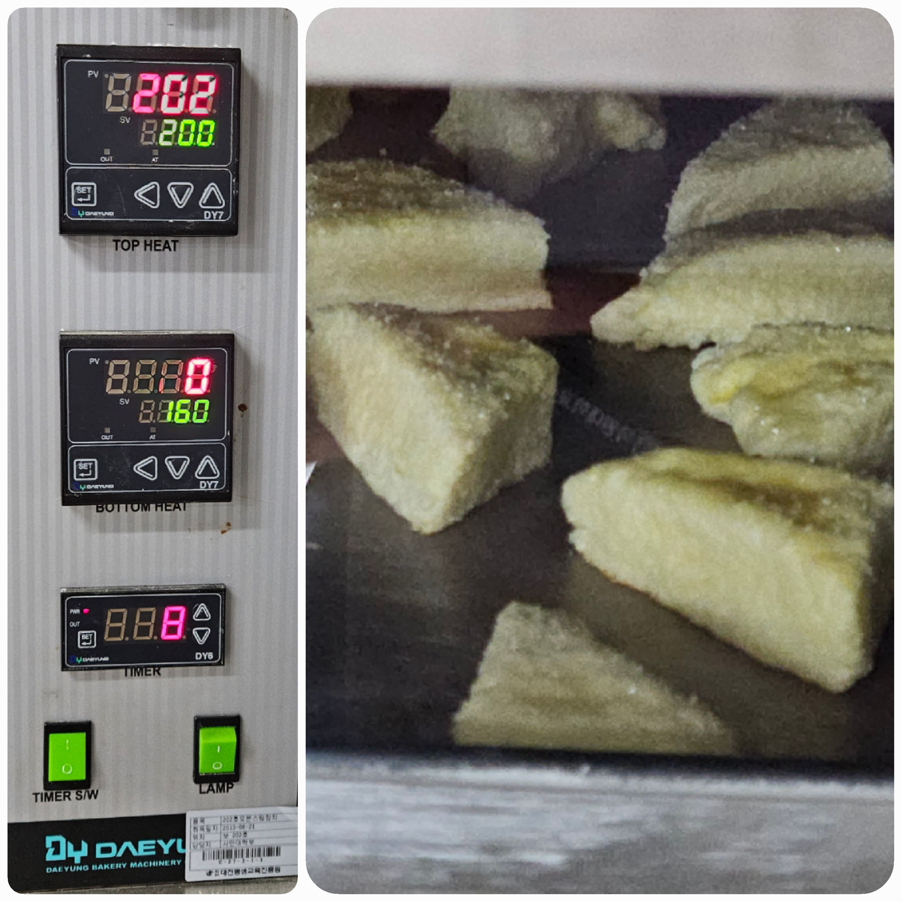: 오븐에 상태와 종류가 다르기 때문에 색을 확인하여 노르스름하게 올라오면 빼줍니다.
