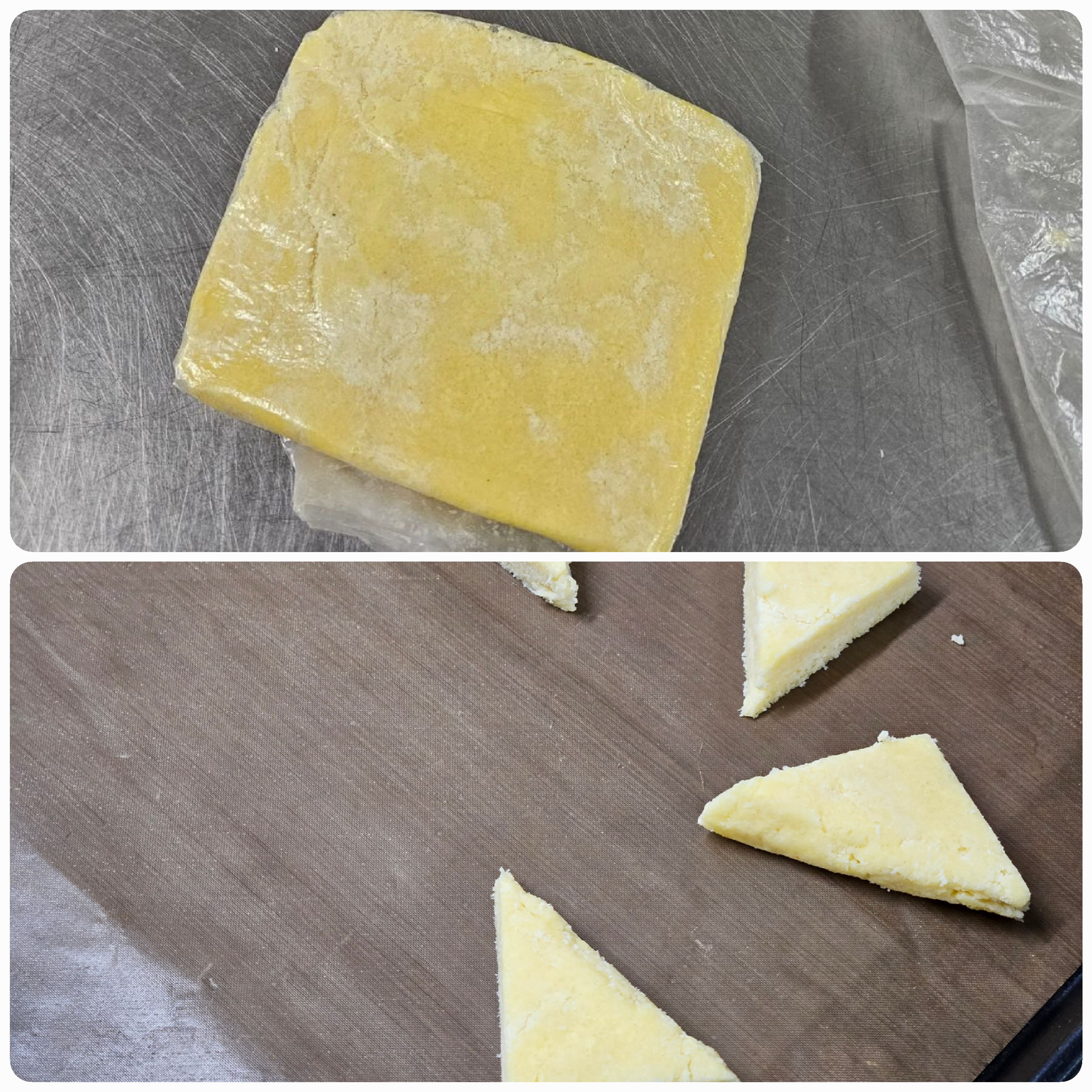 12. 휴지가 끝난 반죽(11)을 꺼내서 스콘모양으로 잘라줍니다.