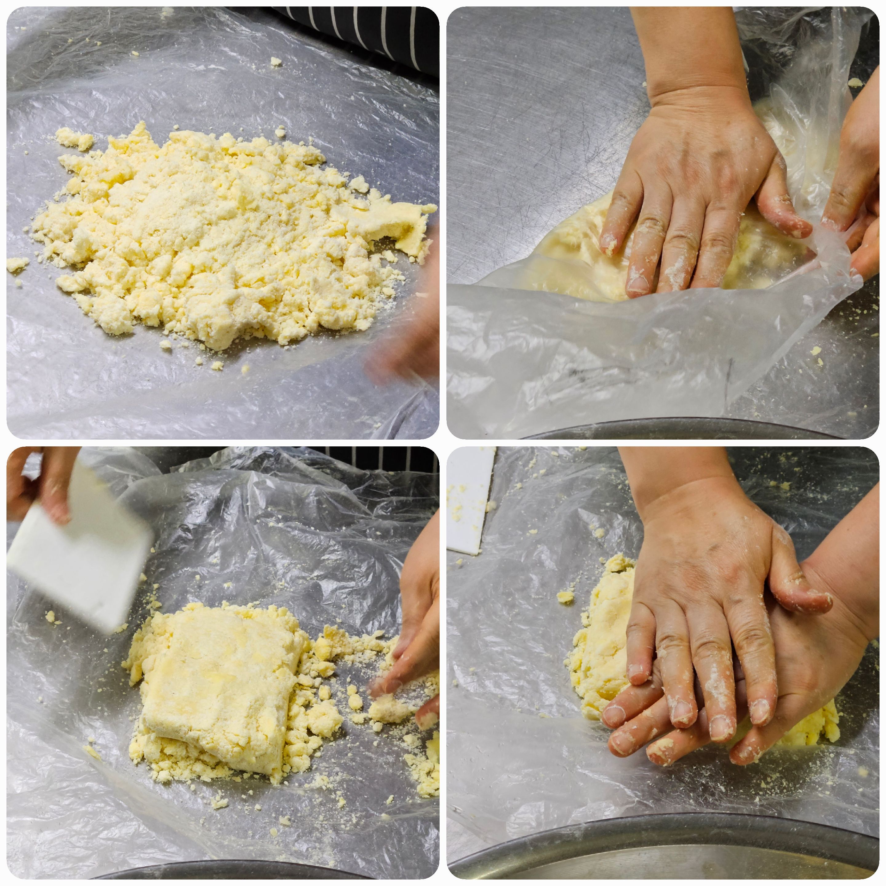 09. 사각형 모양으로 반죽이 형성되면, 스콘의 결을 만들기 위해 반을 잘라 위로 올려줍니다.