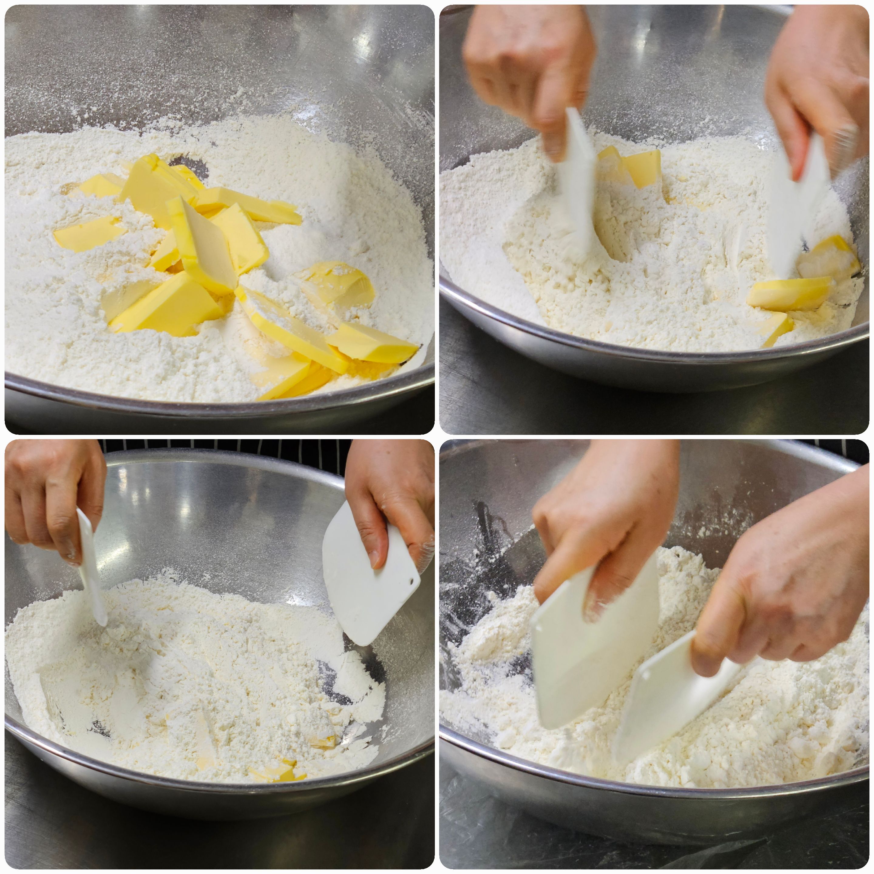 03. 가루재료에 버터를 넣고 스크래퍼를 이용하여 잘게 잘라줍니다.