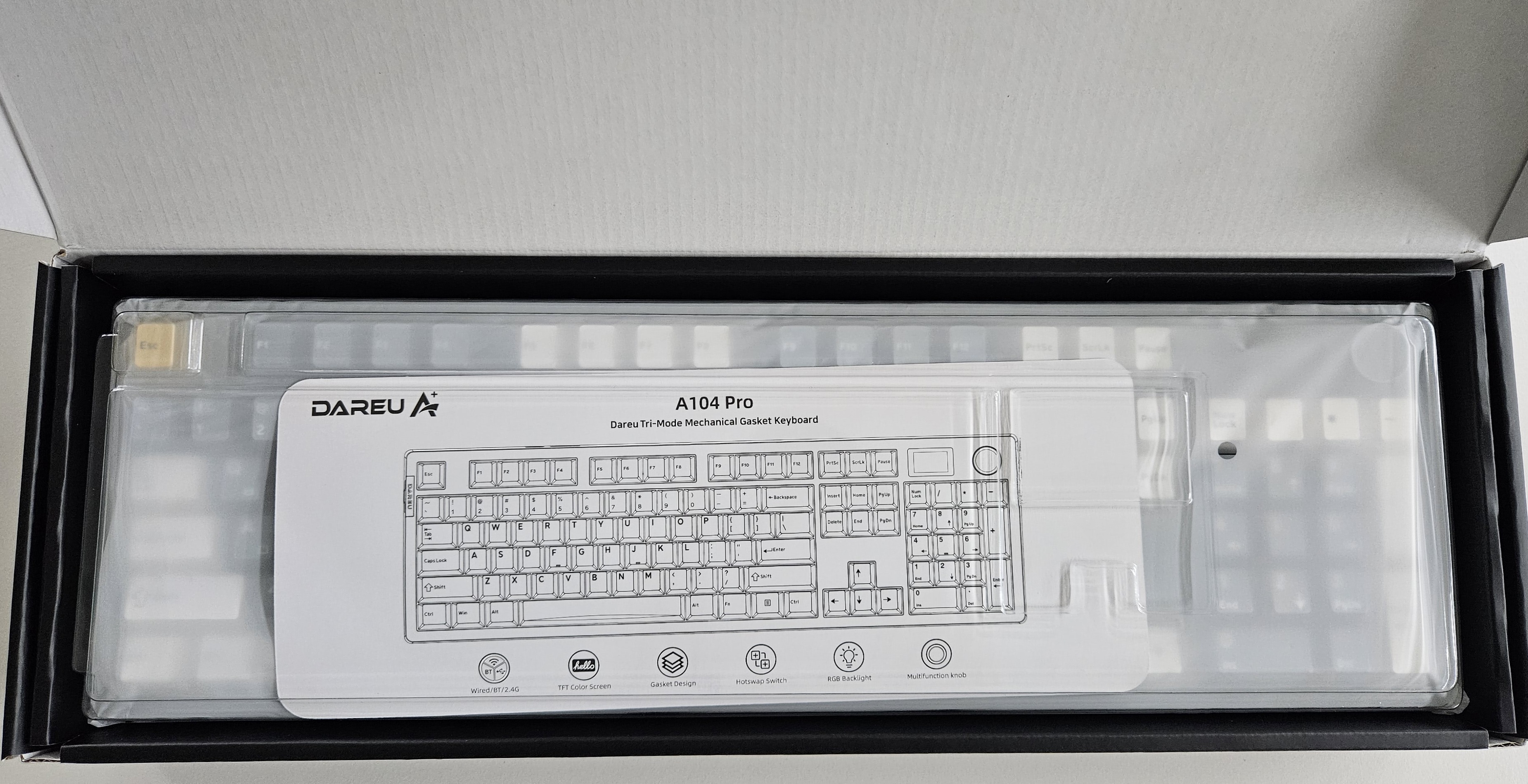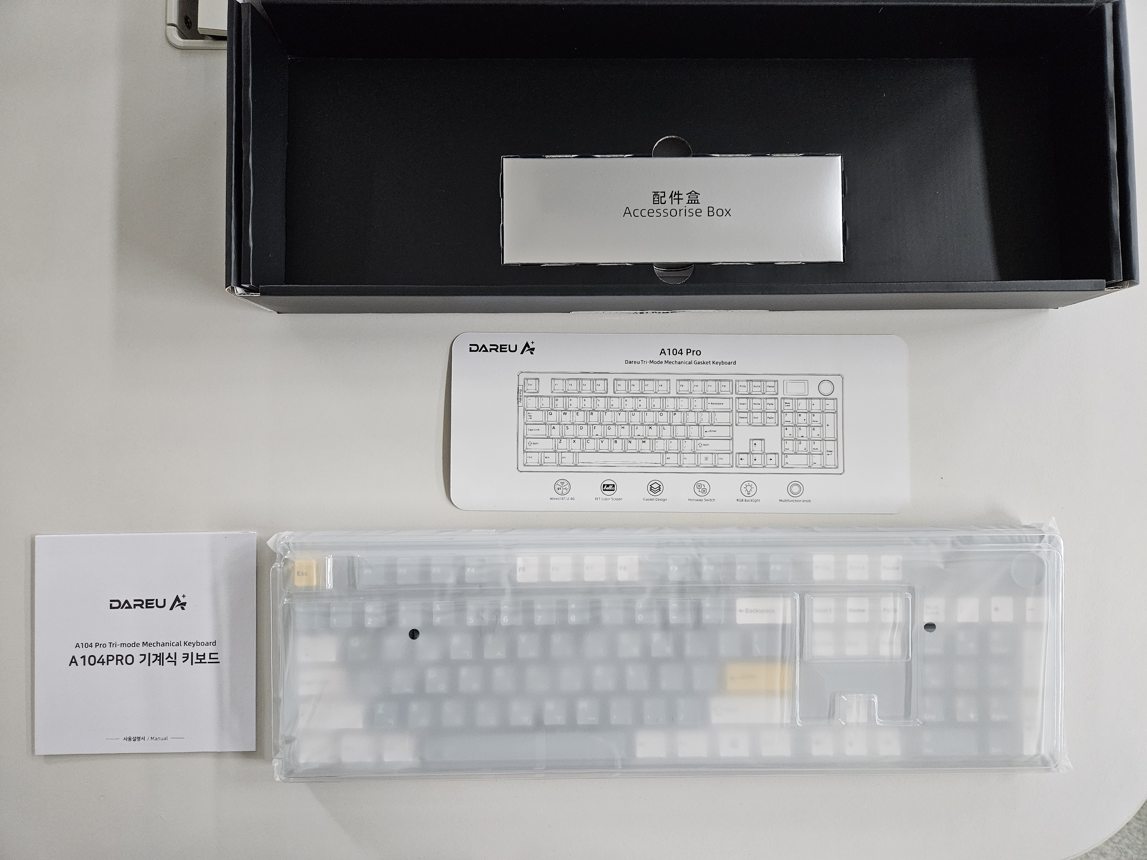 - 키보드는 비닐에 쌓여 있고, 키보드 아래에는 악세사리 박스가 들어 있습니다.