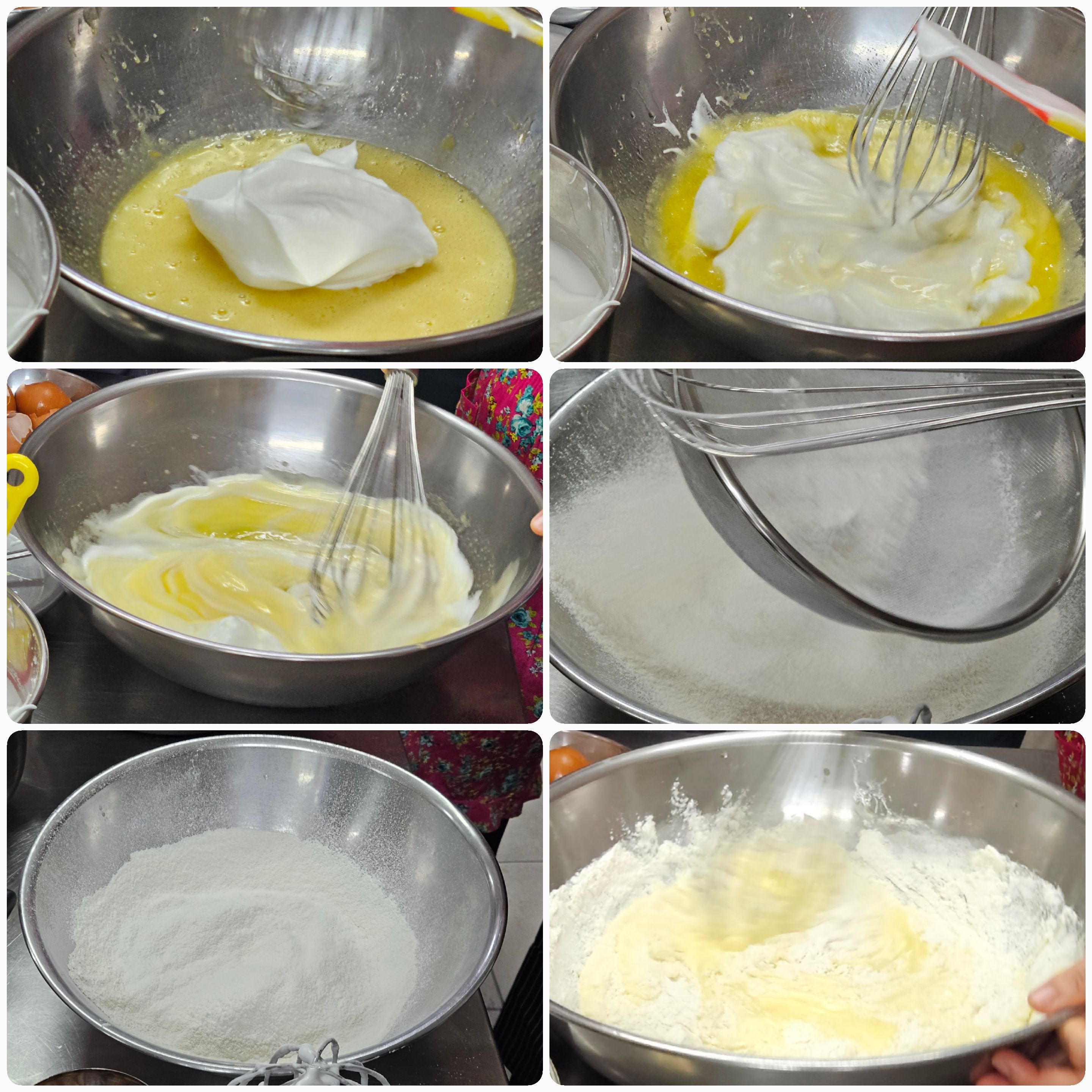 04. 설탕을 녹인 계란(02)에 머랭을 1/3 넣고 섞어준다.