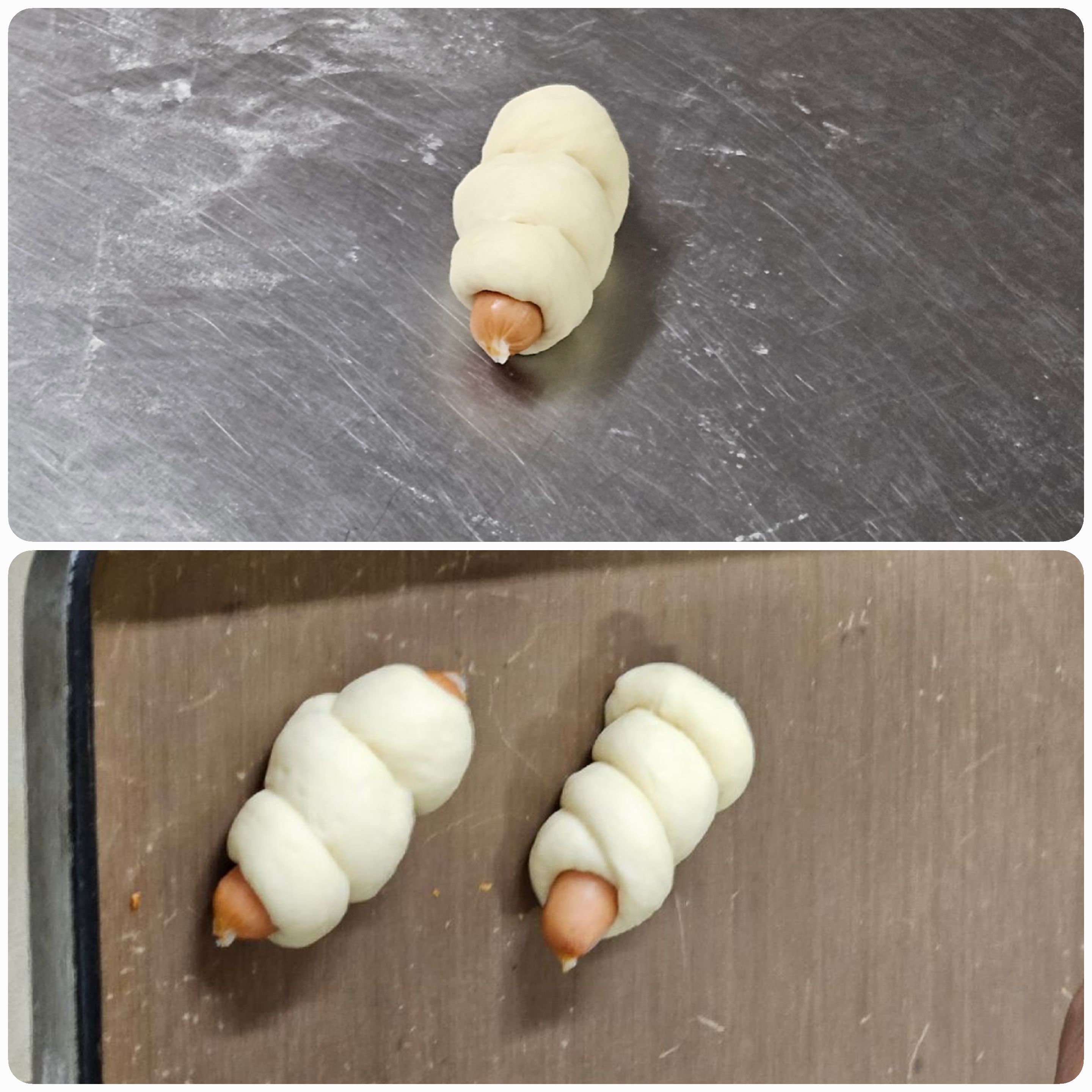 07. 소시지에 반죽을 길게 말아 성형합니다.