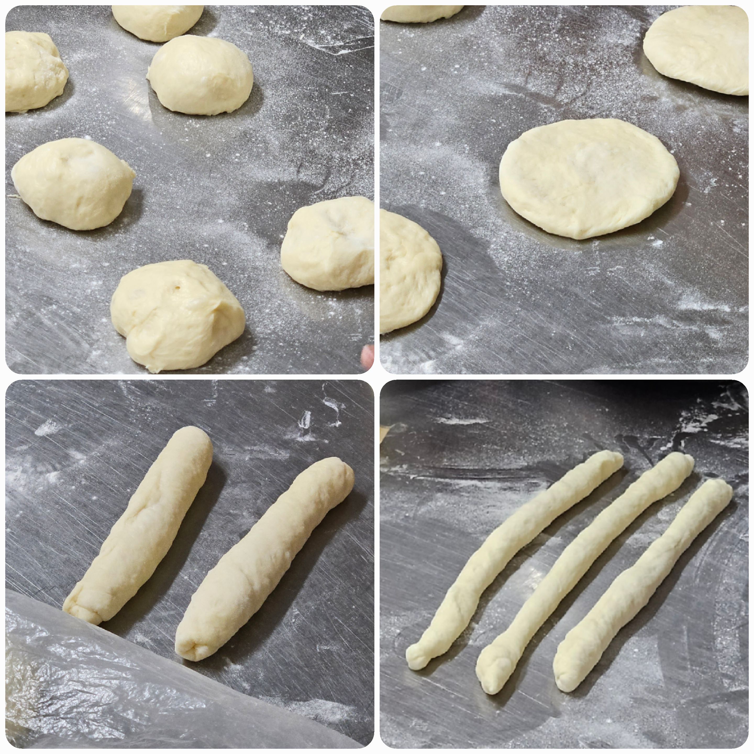 05. 분할한 반죽을 두드려 넓게 펴준 후, 말아서 길게 만들어 줍니다.