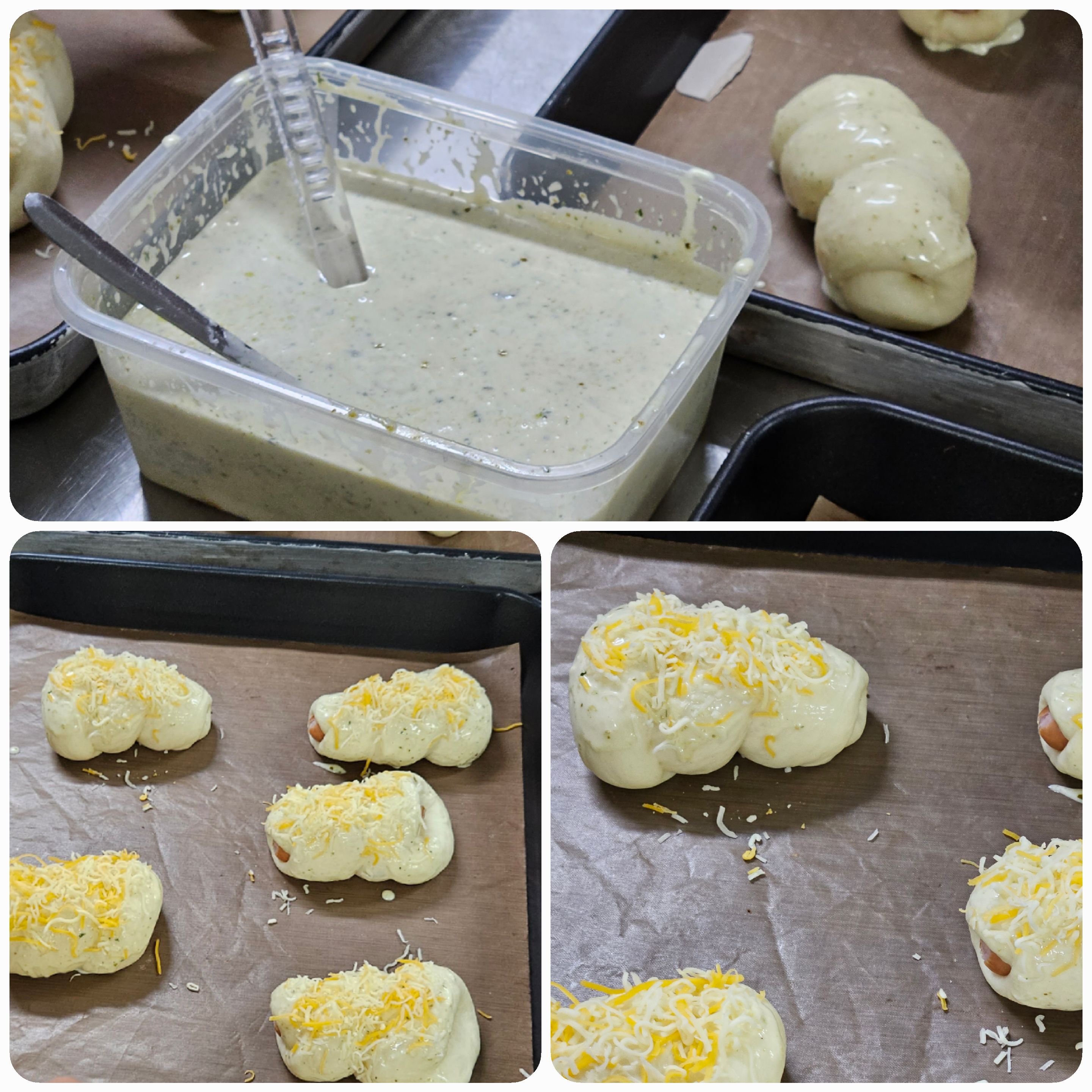 10. 발효가 끝난 소시지빵에 토핑(09)를 잘 발라줍니다.