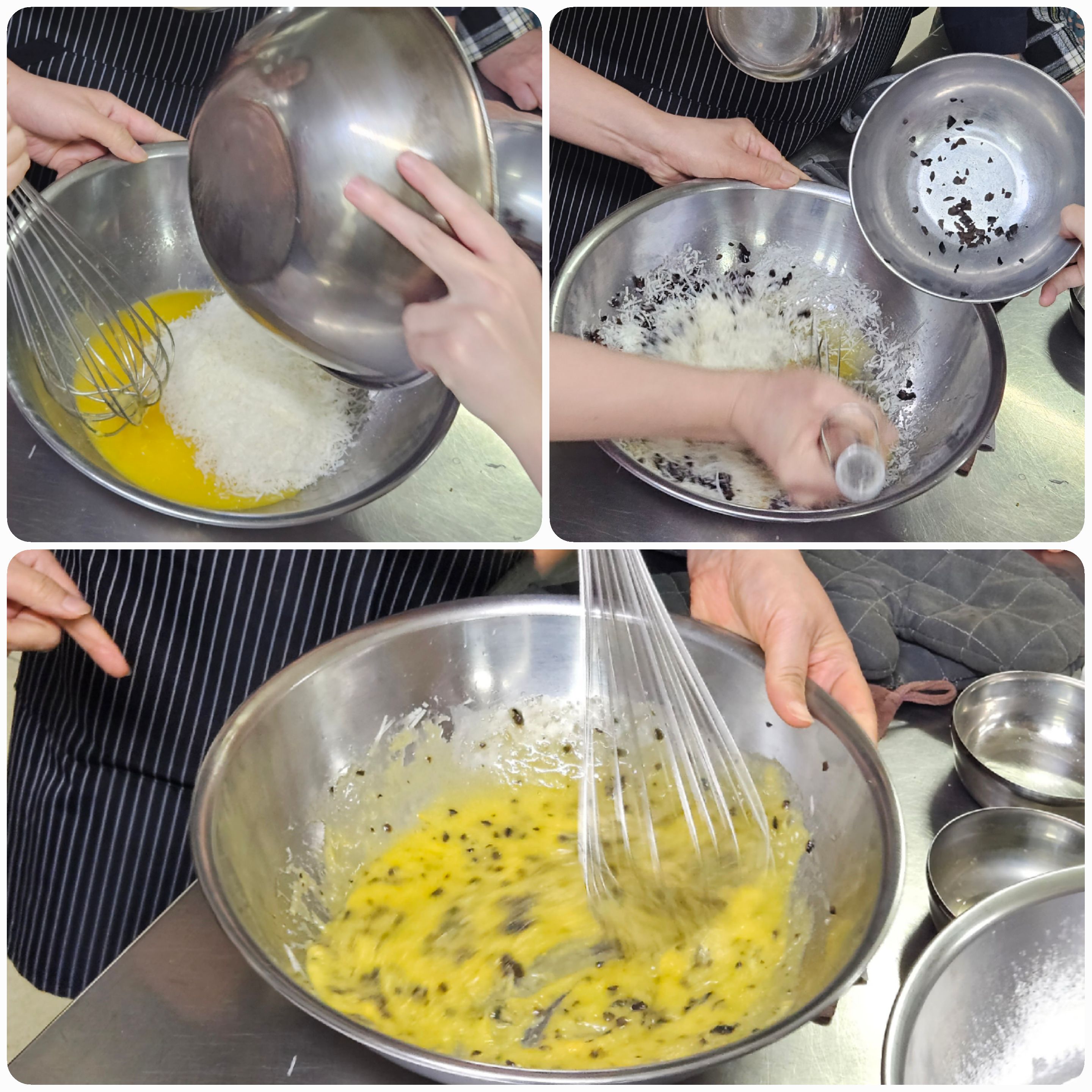 06. 채진 가루재료를 녹인버터(04)에 넣고 칼로 자르듯이 섞어줍니다.