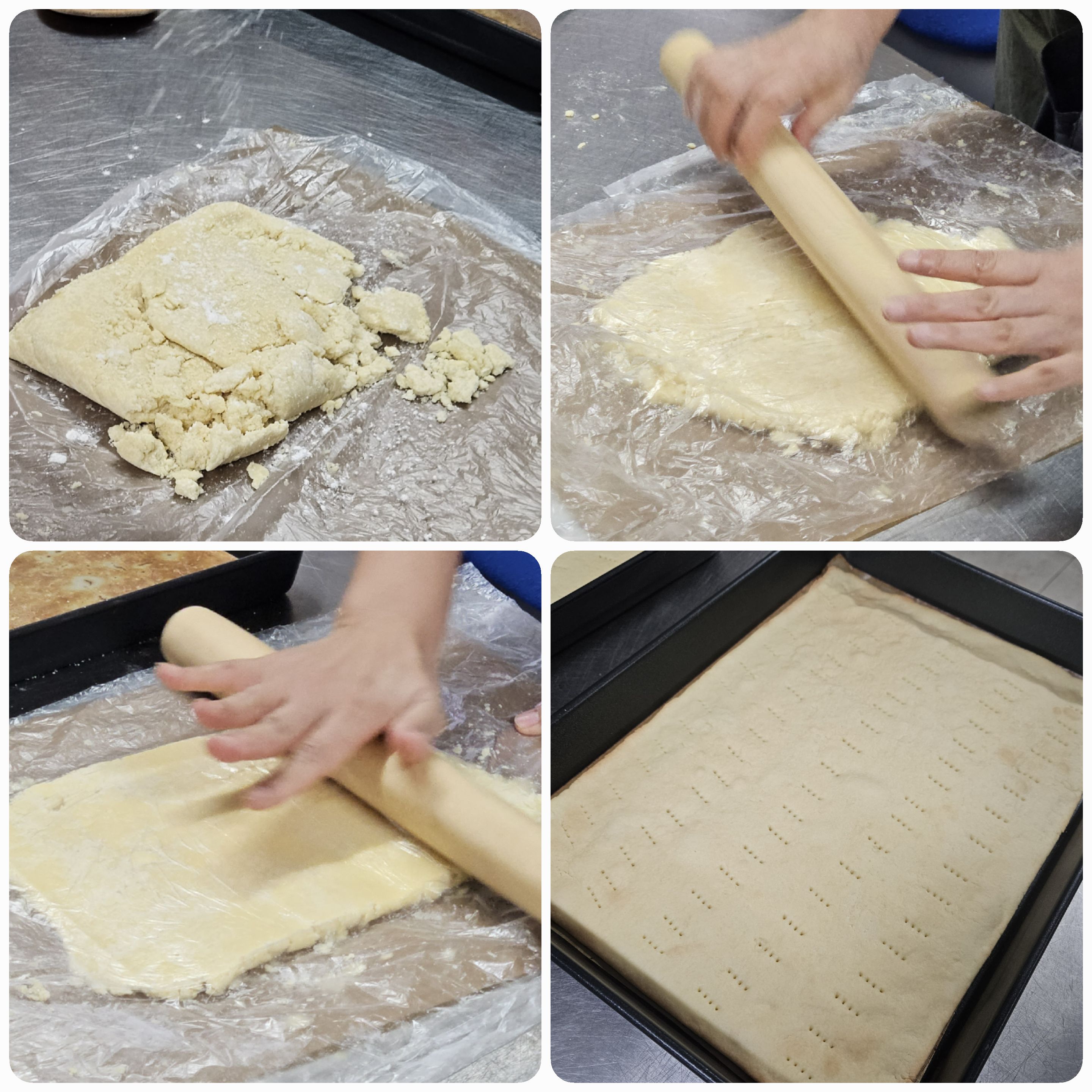 08. 휴지된 반죽을 비닐을 덮은채 홍두깨를 이용하여 넓게 펴준다.