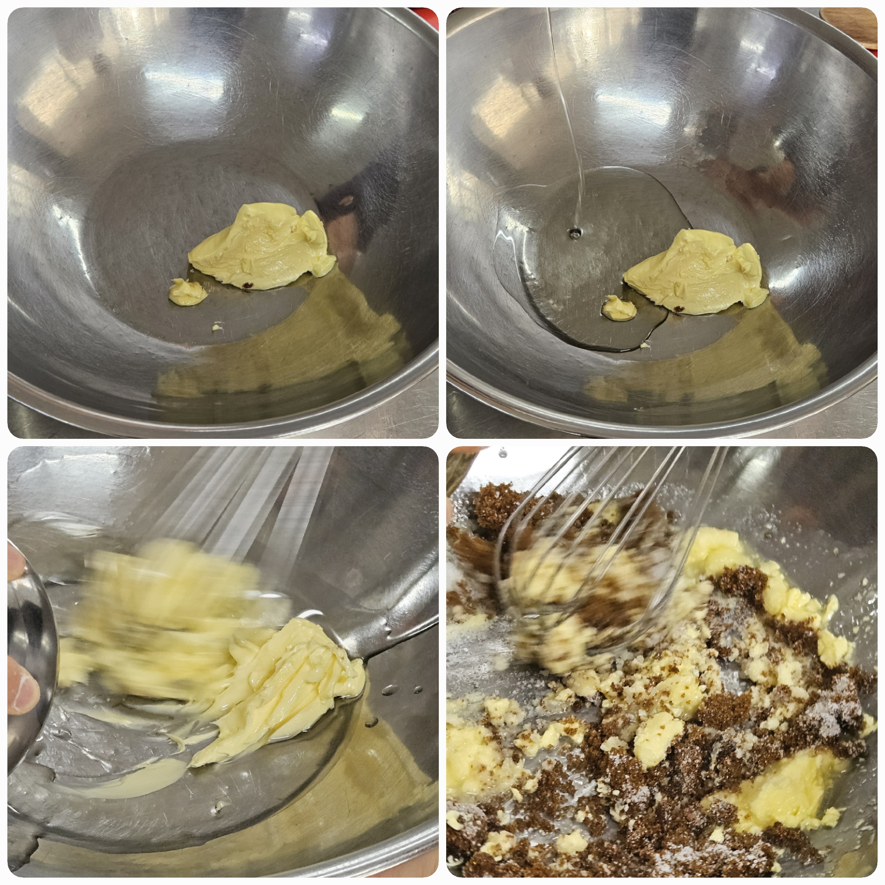 02. 큰볼에 버터와 식물성오일을 넣고 잘 섞어줍니다.