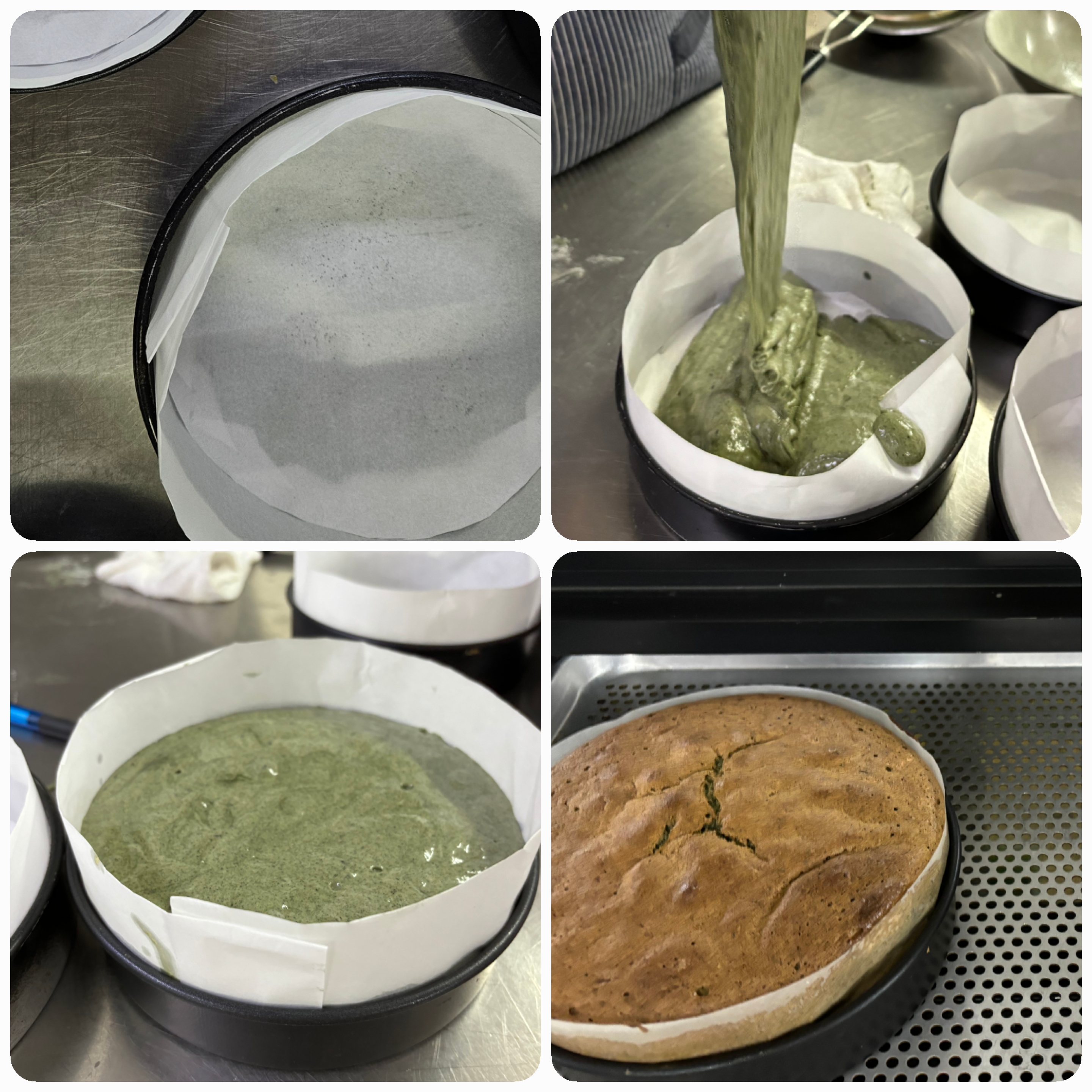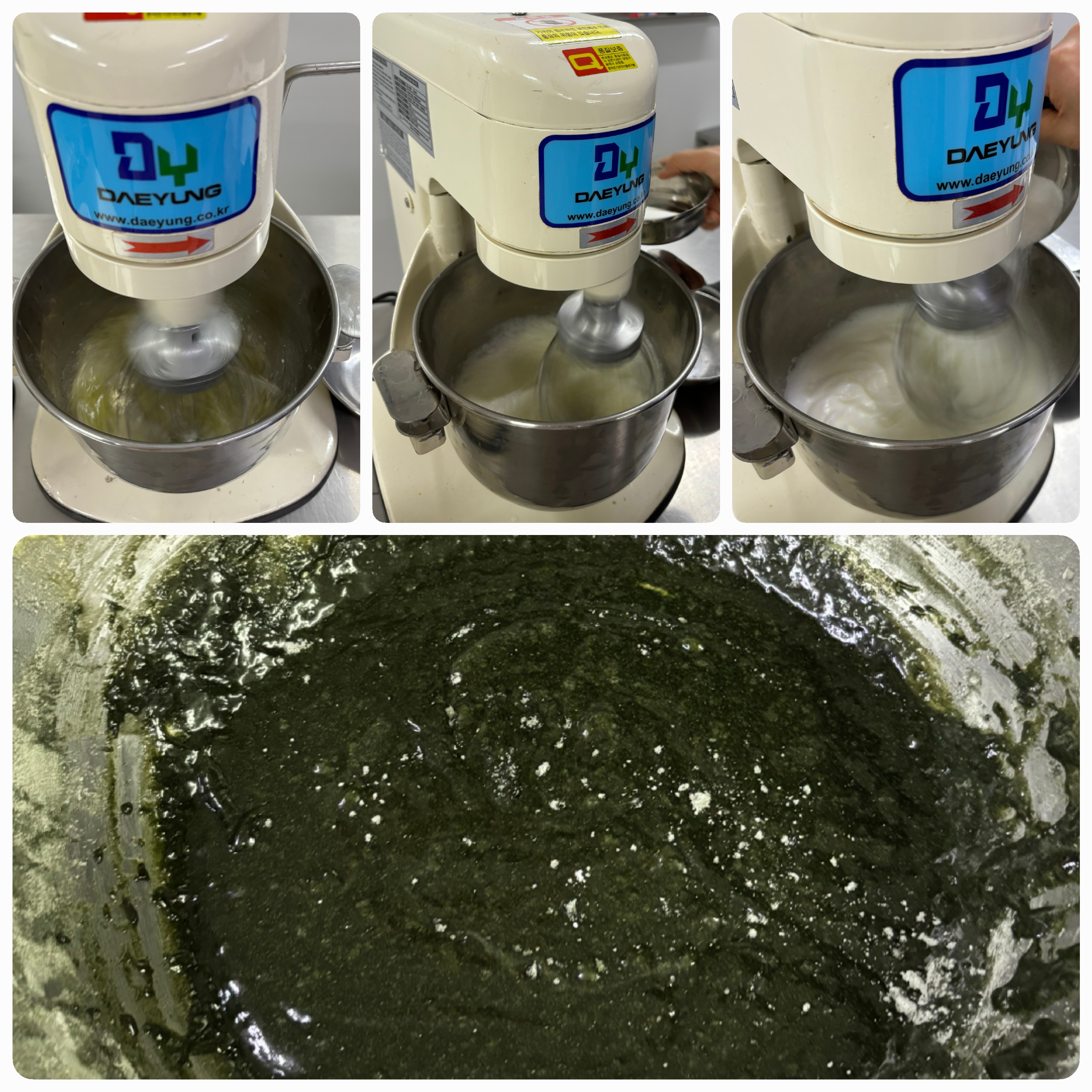 흰색 크림에 초록빛깔의 속살을 가진 케이크가 만들어 집니다.