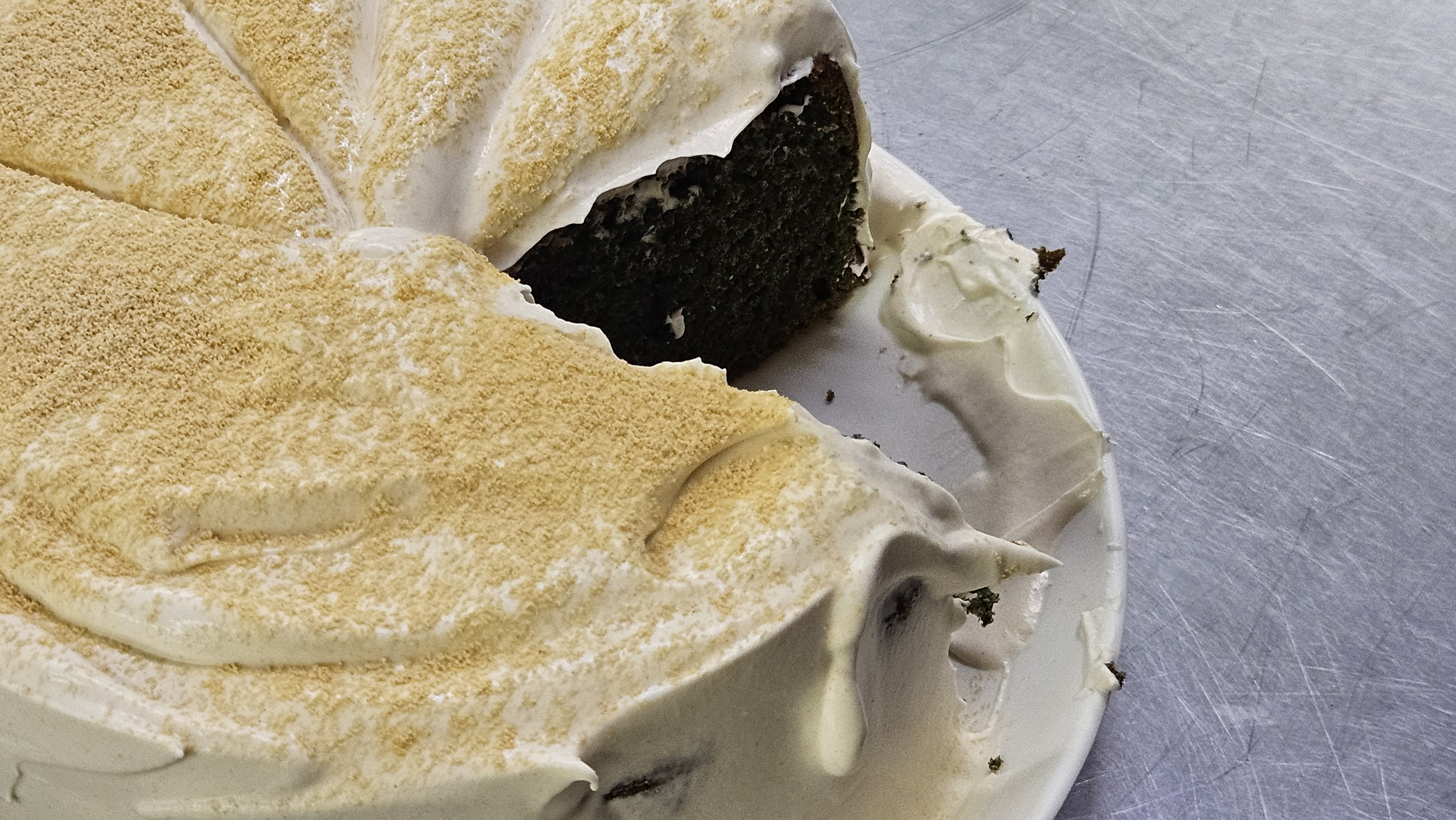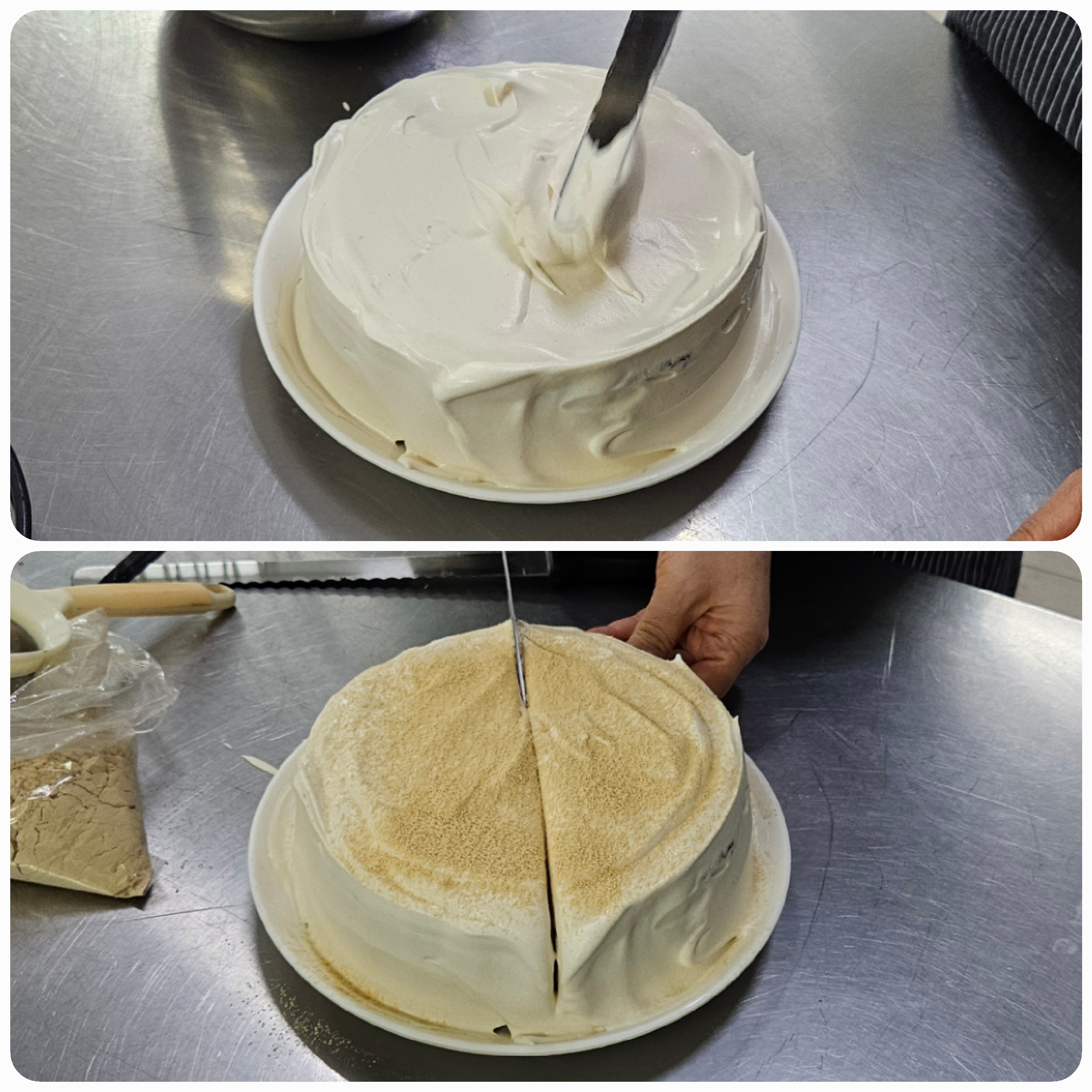 04. 케이크 윗면에 콩가루를 뿌려주면 완성됩니다.