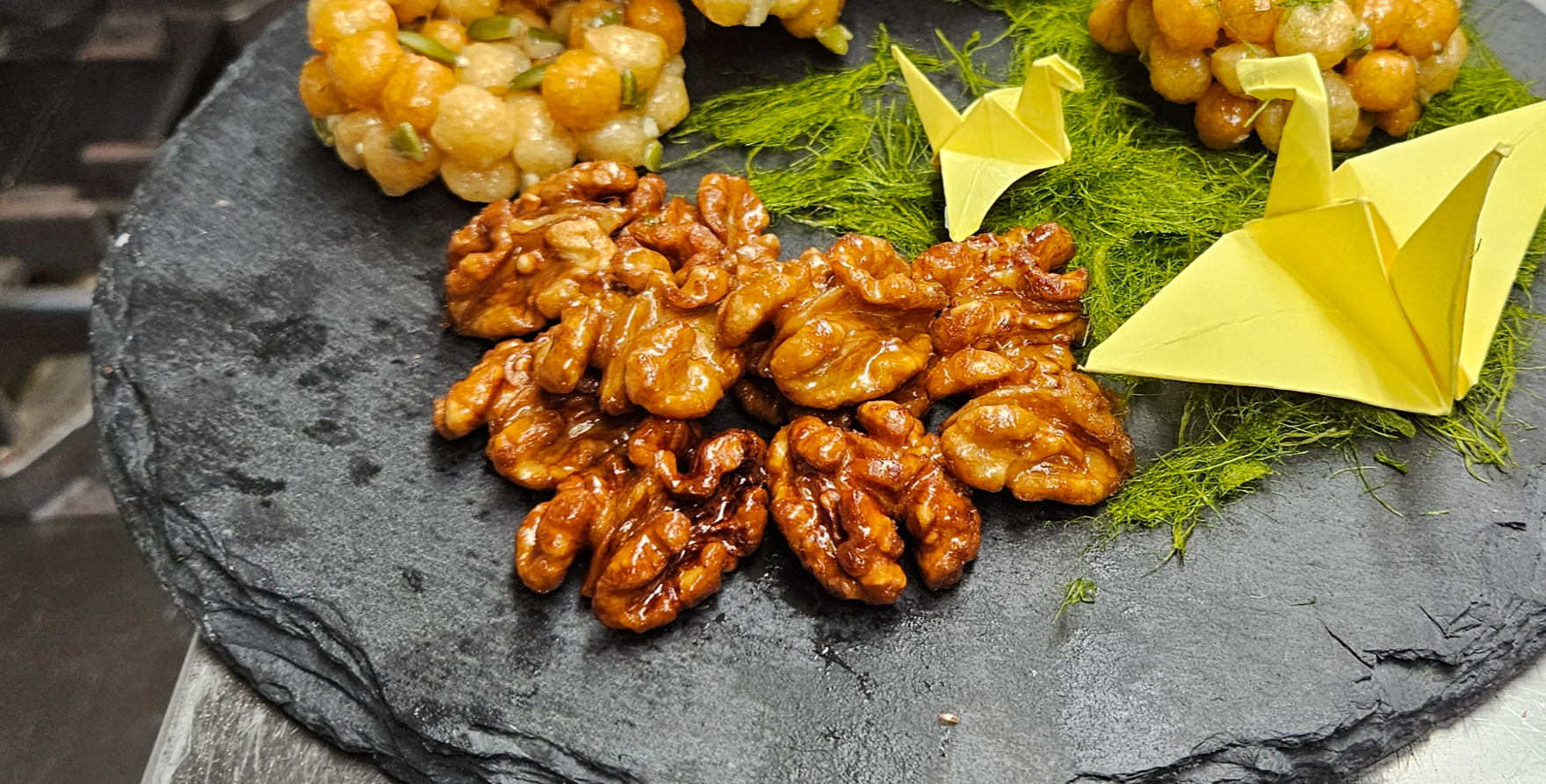 06. 설탕물이 다 녹아 호두에 어느정도 스며들면, 물엿을 한바퀴 둘러줌