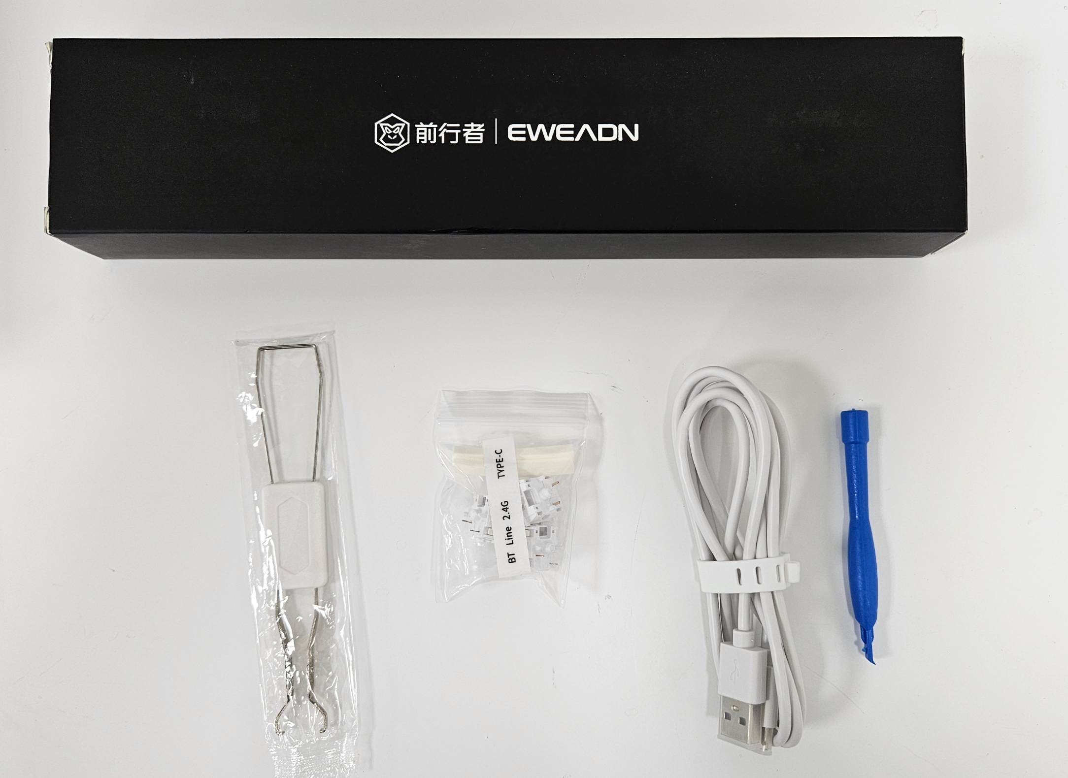 - 상단의 박스를 열면 키캡풀러 x 1, 여분의 키캡 x 3, USB케이블 x 1, 자석부위를 열어주는 해라 x 1